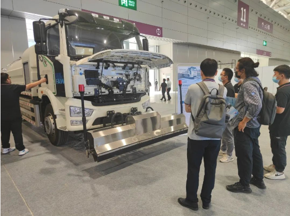 作为参展企业之一,乐天使弘德专注于新能源汽车领域,致力于新能源专用汽车及相关领域的研发、生产及销售,在大会上输出着“乐天使能量”。乐天使弘德积极响应国家政策,新能源环卫车是乐天使弘德重点布局的领域。在1182号展厅,登场的是乐天使弘德新一款18吨纯电动清洗车,此款车型采用宁德时代标准化磷酸铁锂电池,配备电量246kWh,满足客户“一次充电,一天作业”的需求。此款电动清洗车还配置有高压清洗系统和低压清洗两套系统,具有路面清洗、护栏隔离带和人行道清洗、高压喷枪、喷雾降尘、低压冲洗、后洒水、电动40m高射炮等多种功能。特别适用于城市广场、道路路面和路沿的高清洁度保洁作业,可以应对不同的道路清洁需求,应用场景多元化。不仅如此,全新设计的水泵驱动系统可以有效降低车辆作业能耗,提升整车续航能力。真正达到“绿色、高效、安全”,更契合本届博览会“新能源、新业态、新交通”的主题!