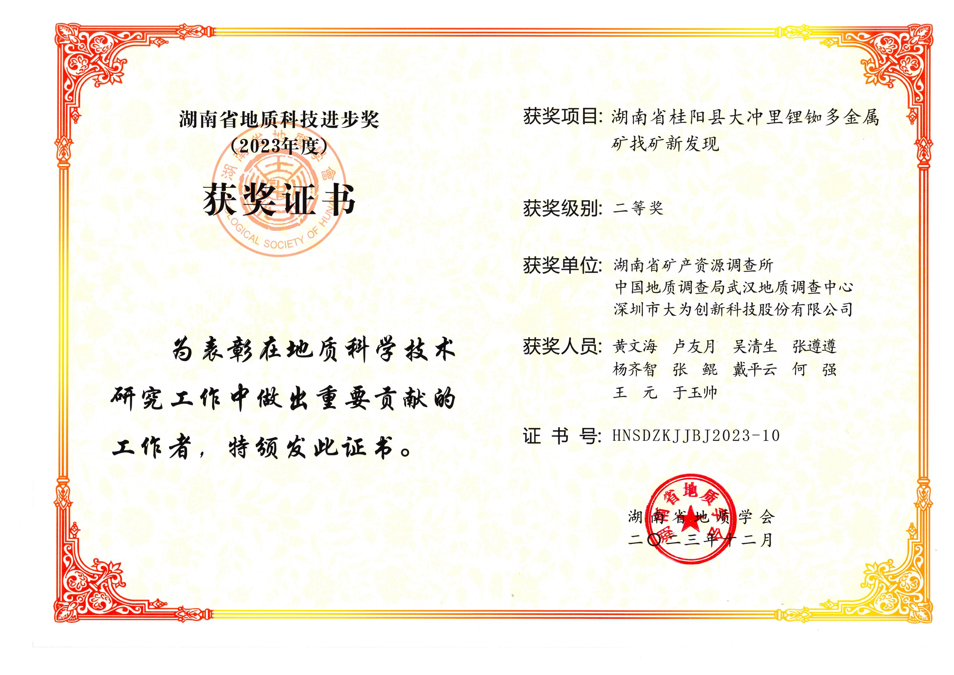 (湖南桂阳县大冲里锂铷多金属矿找矿新发现二等奖)